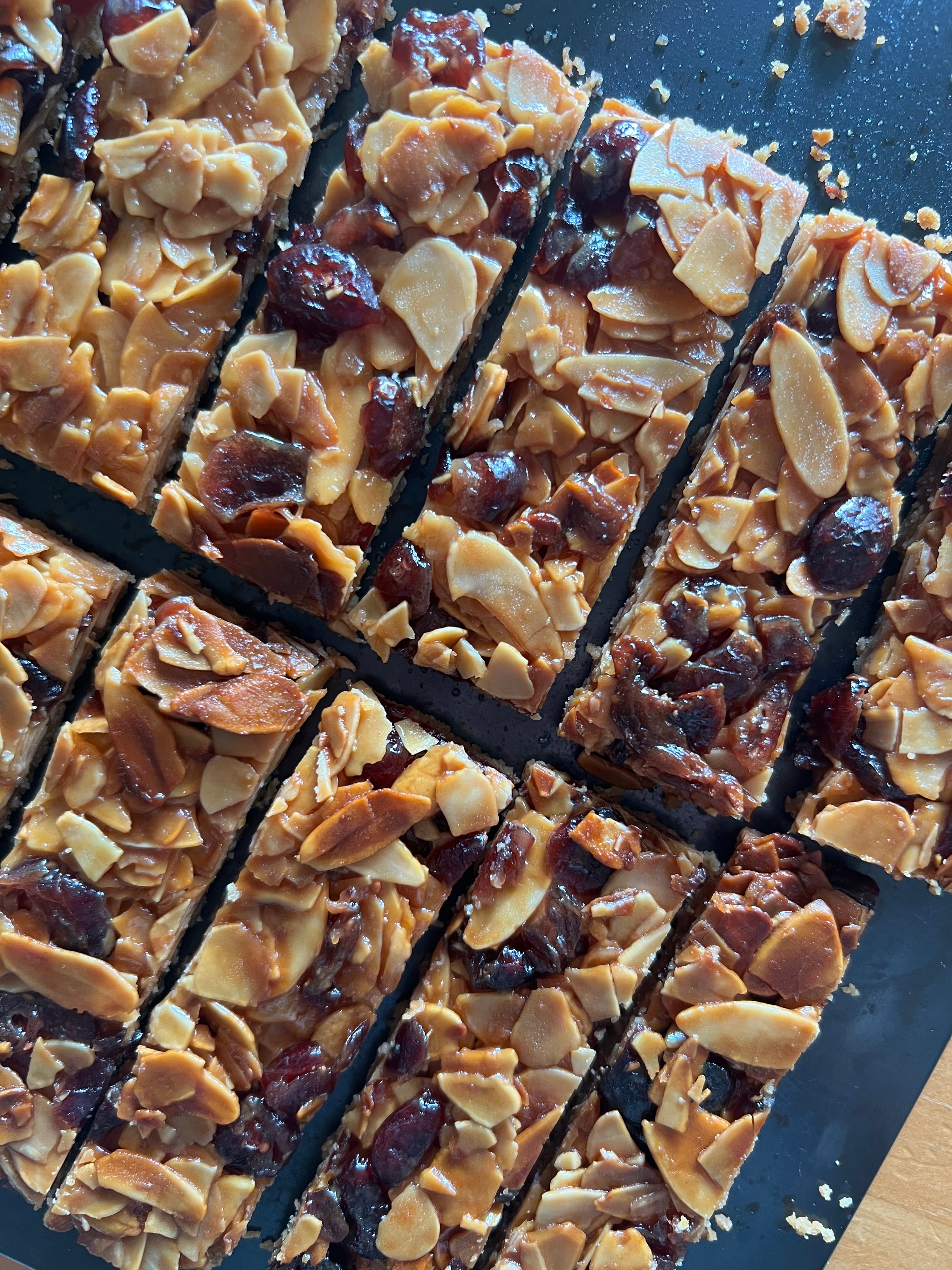こちらはタルトシュクレ、いわゆるタルト生地にはちみつ、生クリーム、発酵バター、有機砂糖で作ったアパレイユにアーモンドスライスとドライクランベリー、ピンクペッパーを絡めて焼いています。